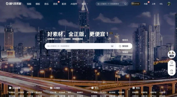优势:内容库质量精良,所有素材都经过精心挑选。提供免费的短视频素材、高质量的免版税音乐、音效和视频模板,堪称一站式的创意资源库。视频模板兼容主流的视频编辑软件。